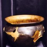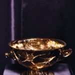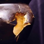 Eppure, Nicola Rivelli, attraverso le tinte “naturali” del metallo, oppure mediante una sapiente applicazione cromatica, nobilita, anche in un senso tradizionale, i suoi manufatti, i quali riflettono in ogni punto i bagliori dell’oro, quel “colore” che, dai bizantini a Klimt, evoca un rimando a una dimensione elevata, trascendente, spirituale. Nella cultura orientale, che ha un certo peso nella vicenda dell’artista, esiste un’antica pratica, che va sotto il nome di Kintsugi, per la quale i vasi rotti, le ceramiche fratturate vengono riparate e rinsaldate proprio con l’oro, il quale, venendo colato nelle spaccature, volutamente, ne evidenzia, piuttosto che nasconderli, i segni, le fessurazioni, le ferite, le cicatrici. Per i seguaci di questa semiotica, così smaccatamente vistosa, essa accresce il valore degli oggetti, perché ne sottolinea il tracciato esistenziale, la memoria.